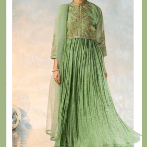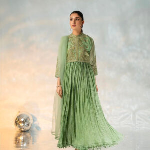 Crafted in a delicate pistachio hue, this 3PC set features a flowing crush silk shirt, an elegant matching dupatta, and a beautifully tailored jacket for a look that is both timeless and sophisticated. The lightweight, crushed silk fabric drapes effortlessly, giving you a graceful silhouette perfect for festive occasions, weddings, or evening gatherings.